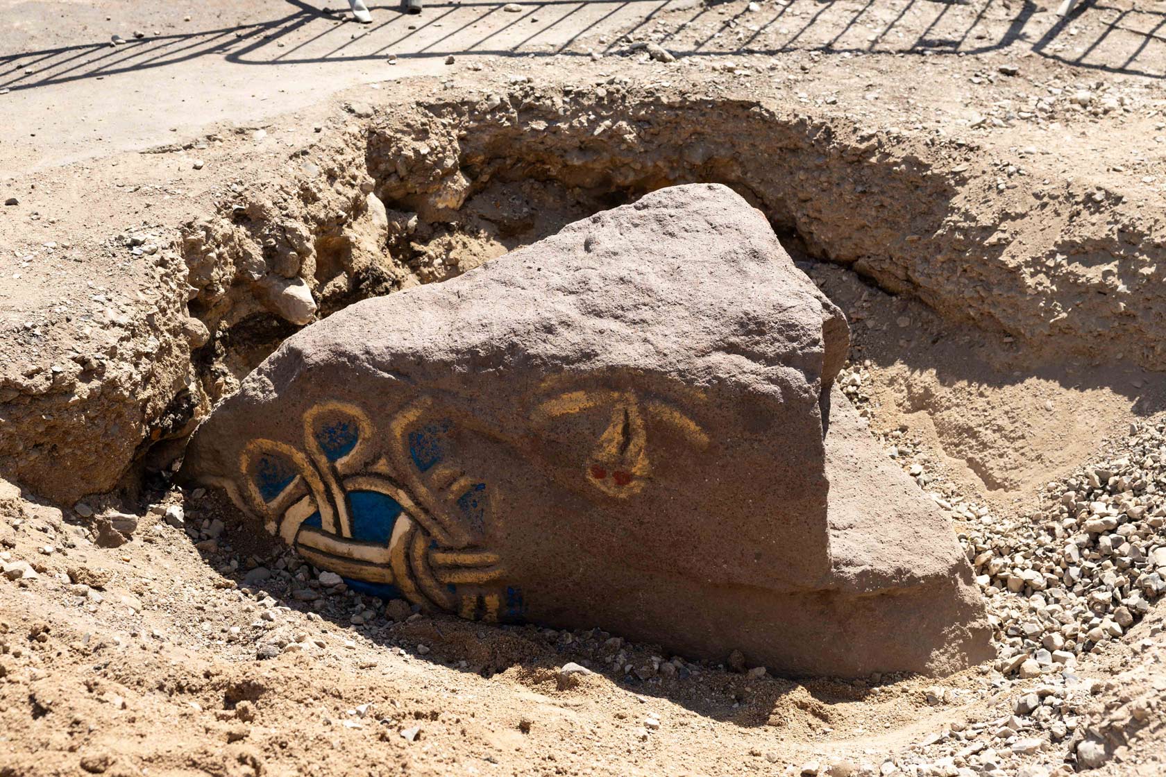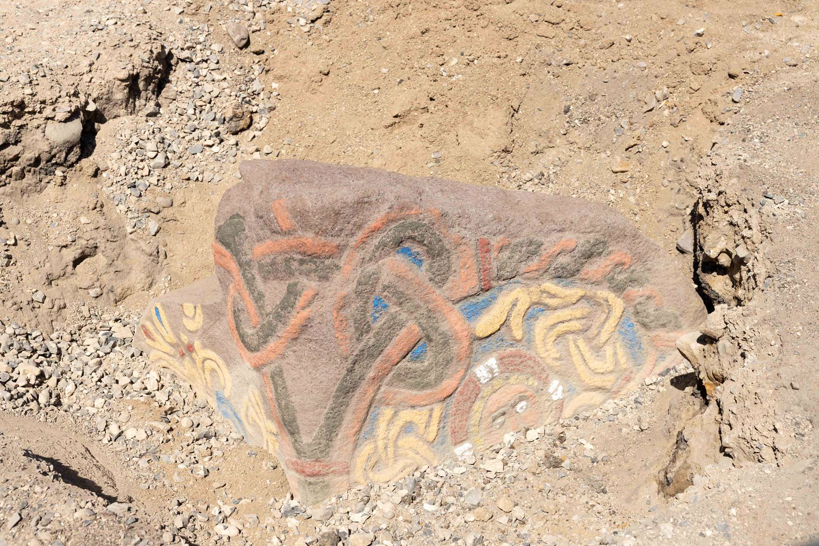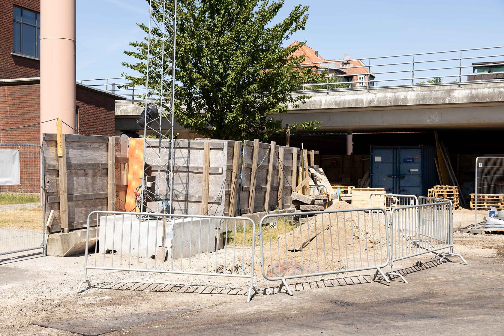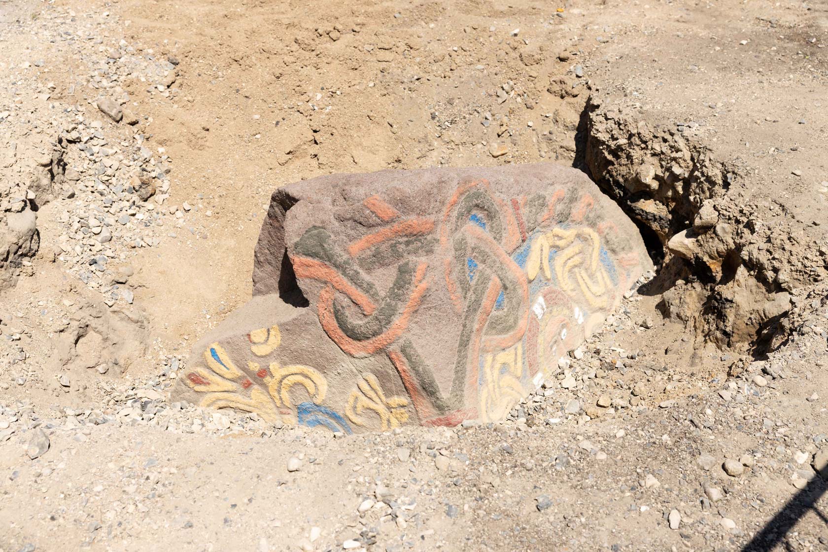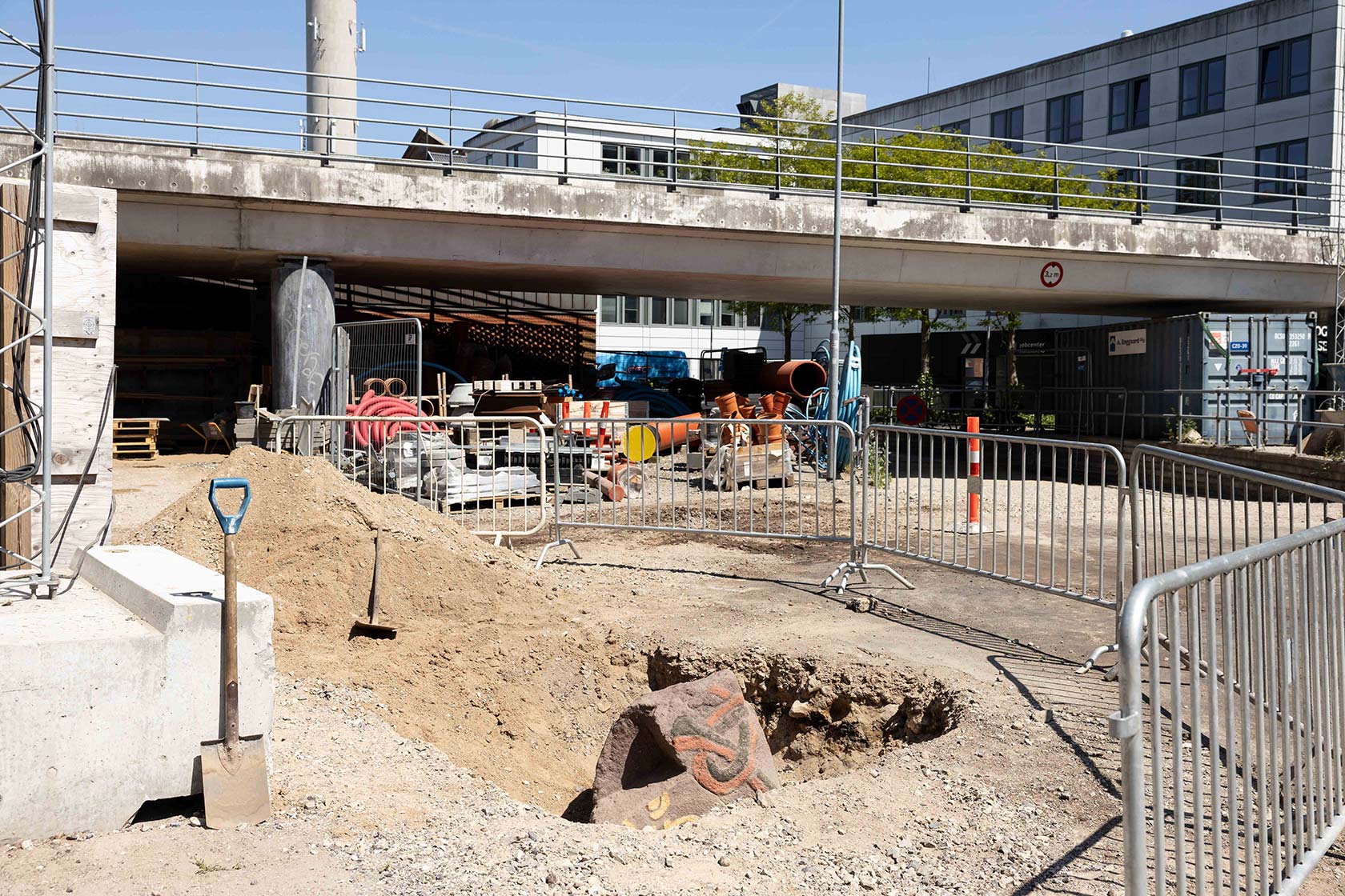 “Fundet af en ny Jellingsten” stages an excavation of a replica of a famous danish monument “Harald Bluetooth’s Jellingstone”, at a construction site next to the exhibition space Udstillingsstedet Spanien 19 in the south harbour area of Aarhus. The Jellingstone is a huge stone with runes and carved imagery, from around 960 ad., located in the small town of Jelling, known amongst other things as the “baptism certificate of Denmark”. In this version the reliefs on the stone are painted in the same color scheme as that of a 1:1 replica of the Jellingstone from 1933, that was located in the courtyard of The National Museum of Denmark. That replica was painted in a color scheme selected by the poet, activist and autodidact art historian Rudolf Broby Johansen, as his suggestion of how the original stone may have looked like originally (there are no visible remains of colors on the stone in Jelling).