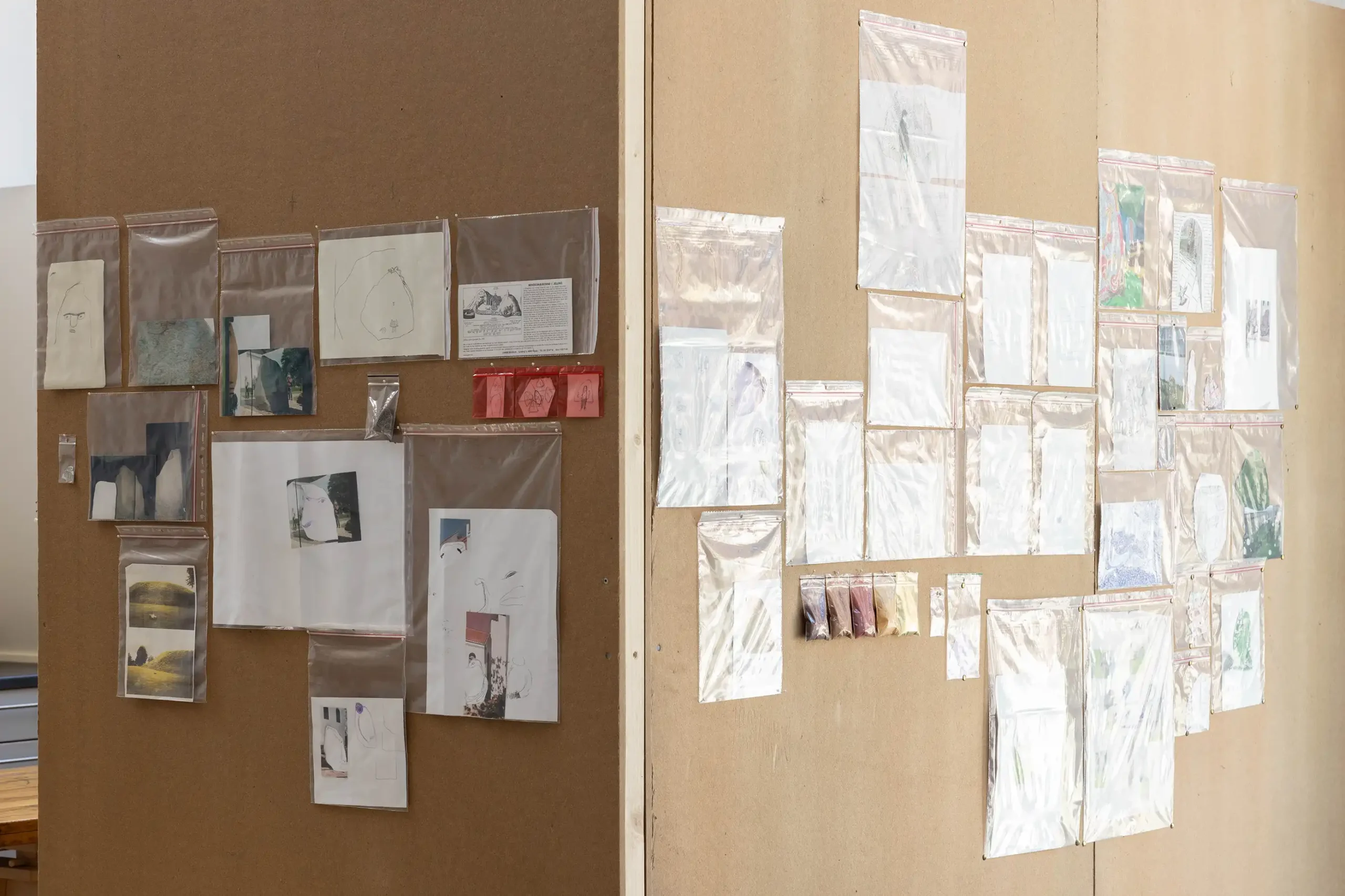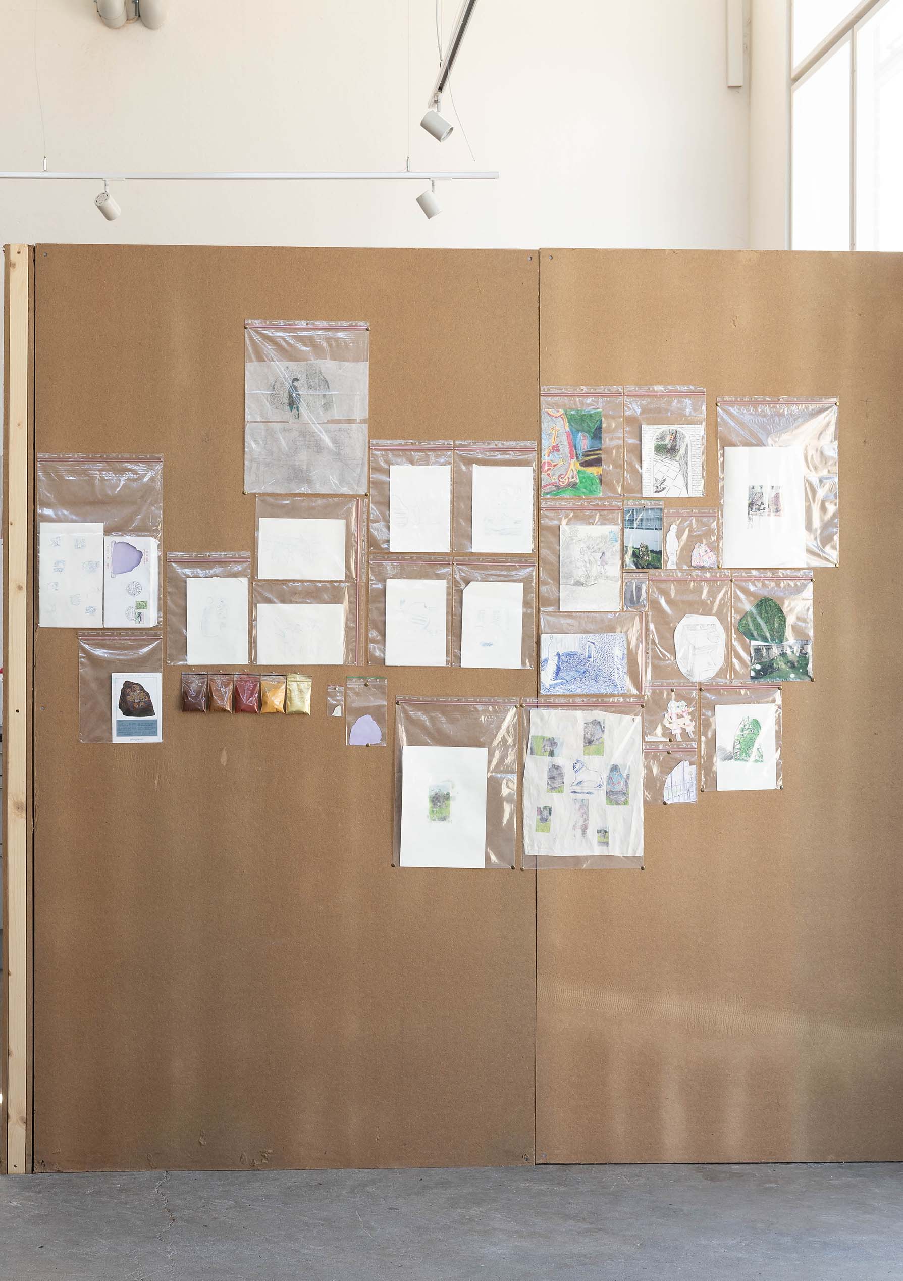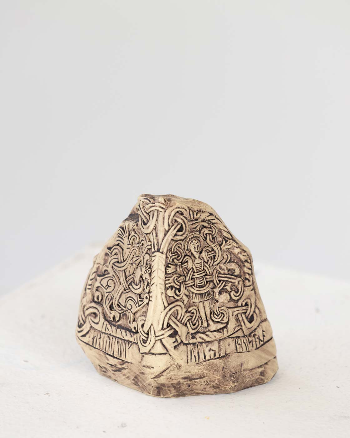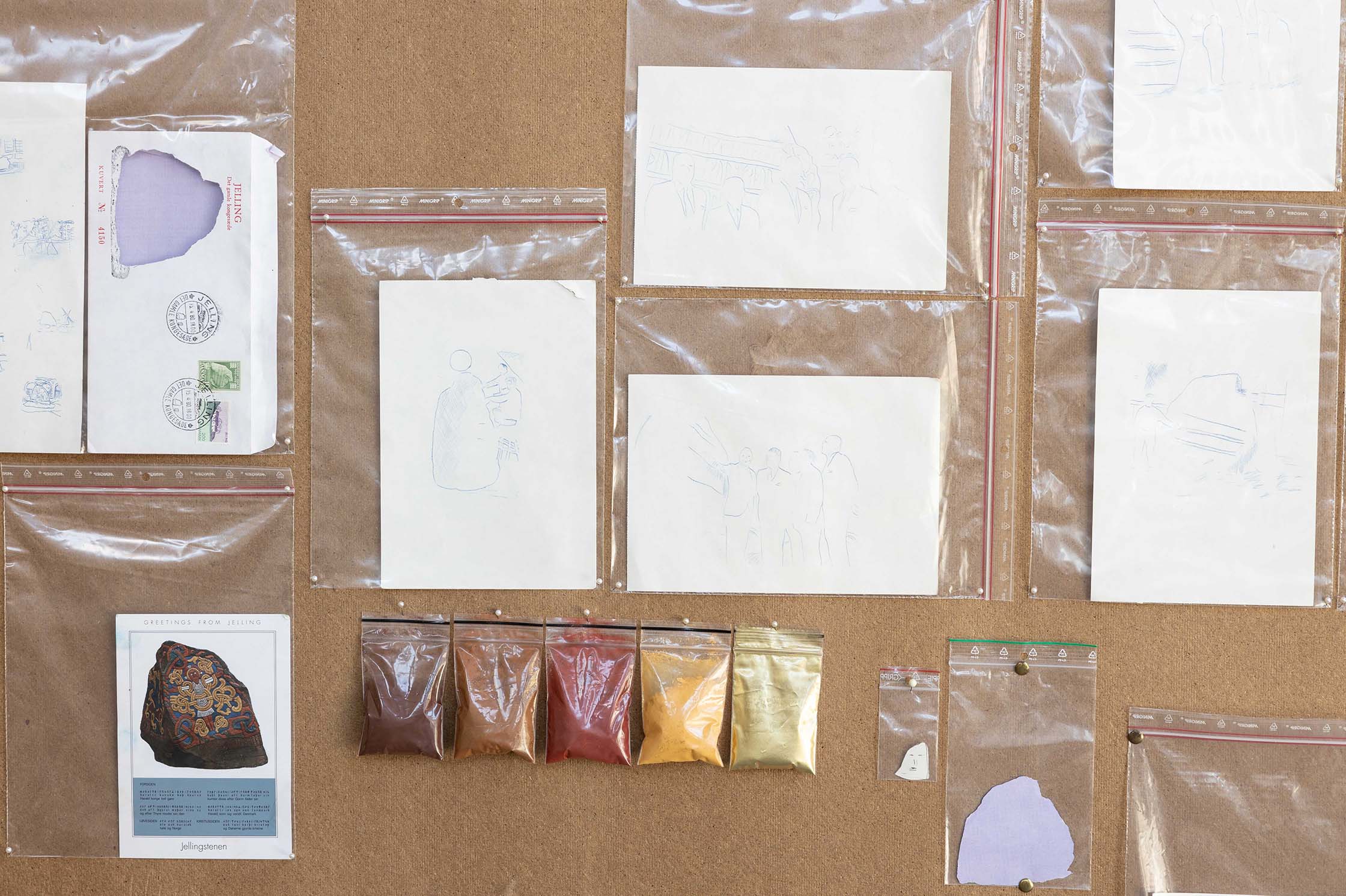 The installation relates to a longer history of copies of the Jellingstone. This was further elaborated inside the exhibition rooms of Udstillingsstedet Spanien 19, where I had installed various materias conveying fragments and stories of a series of Jellingstone copies located around the world.